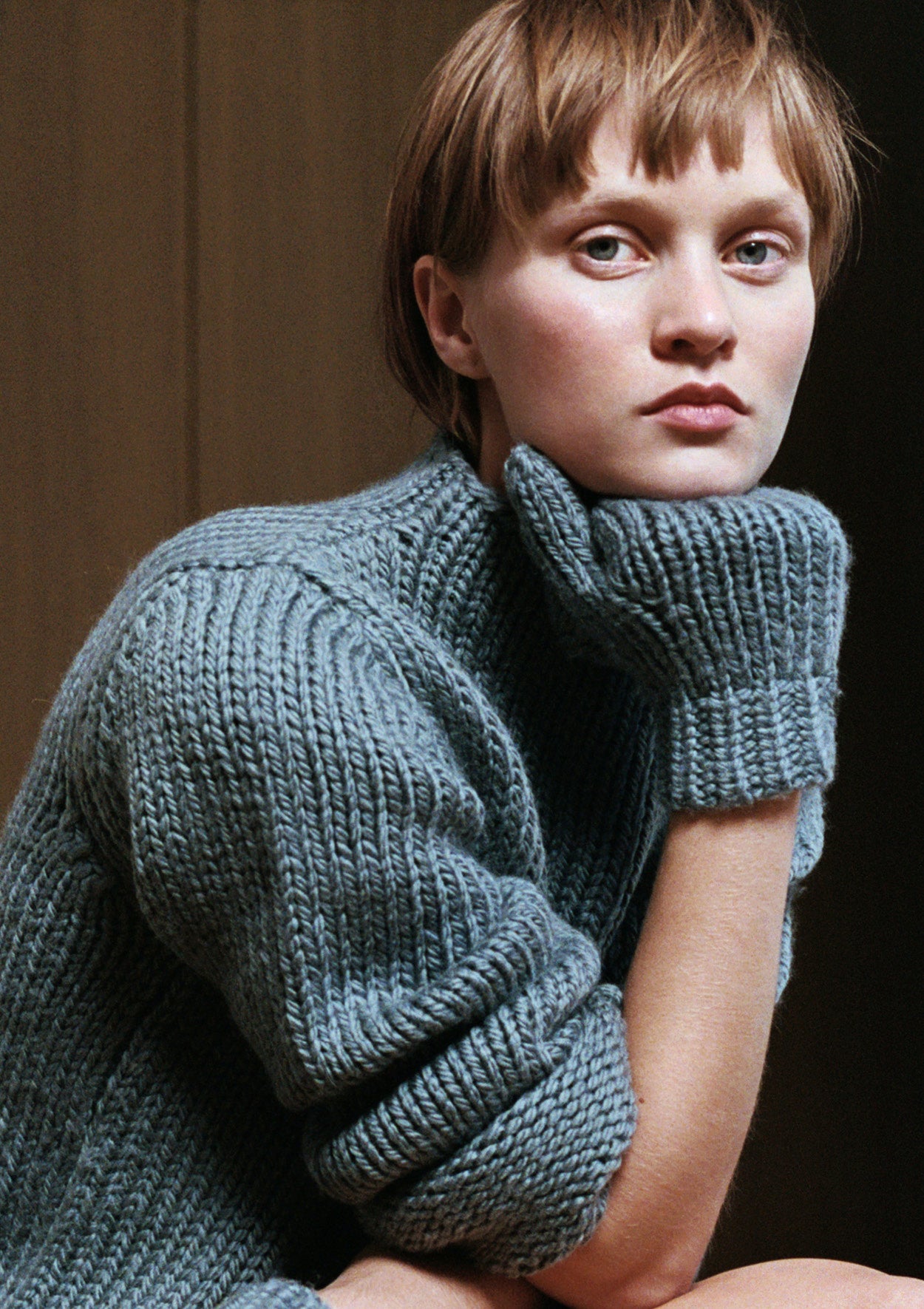 An oversized suit taken from the male wardrobe appears alongside a pared-down strapless wool dress. Shearling warms the body, while leathers glow in deep olive green or glossy black. Fine-gauge knits glide softly over the skin. Ivory Théa pumps, the Suzanna patent leather bag and a pleated silk scarf complete this sophisticated and understated look.