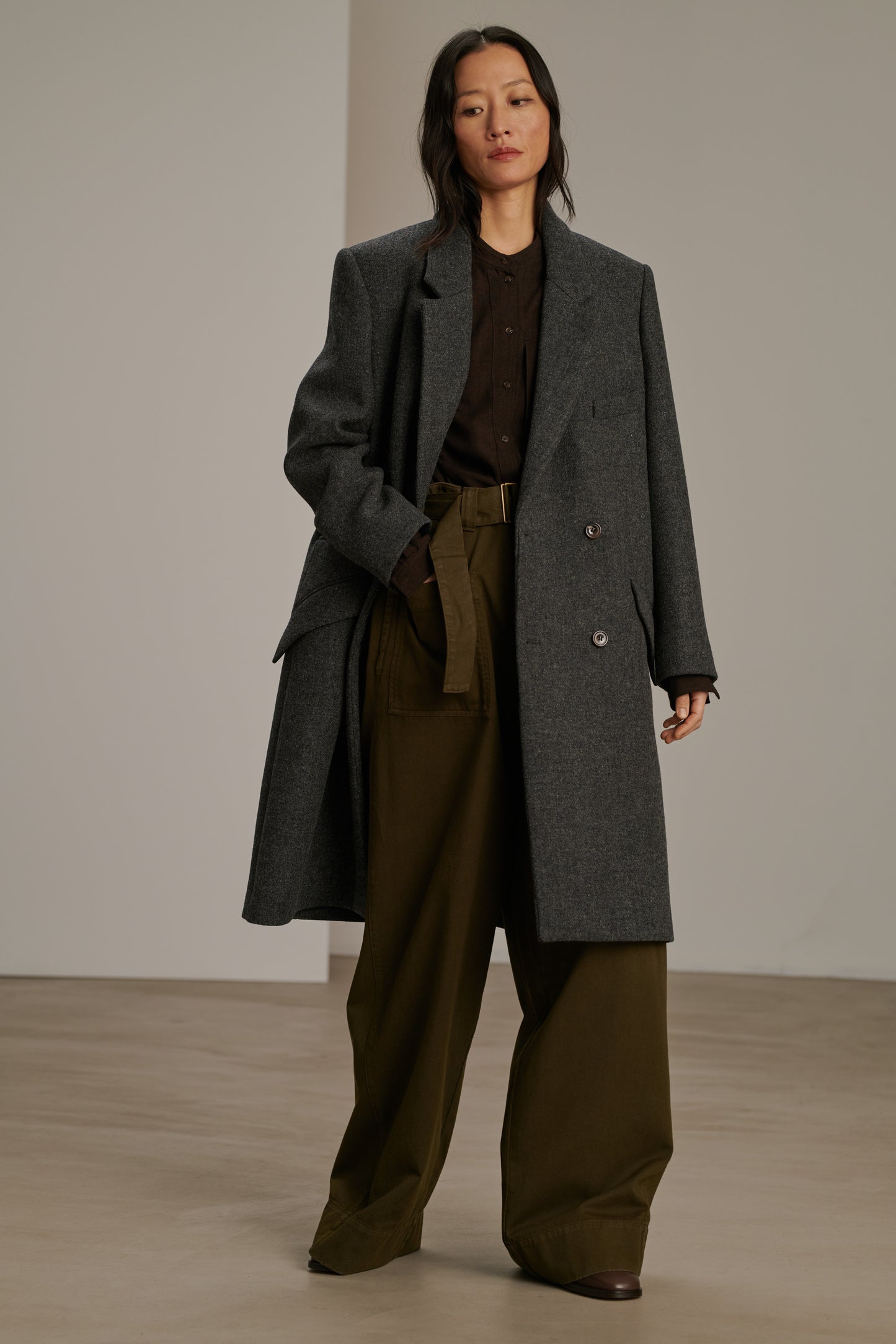 WADDEN is a mid-length coat in mottled grey double tweed. Designed with a straight fit for a sleek silhouette, it captivates with its timeless masculine look. Featuring an elegant tailored collar and a front button placket, it combines style, sophistication, and modernity.