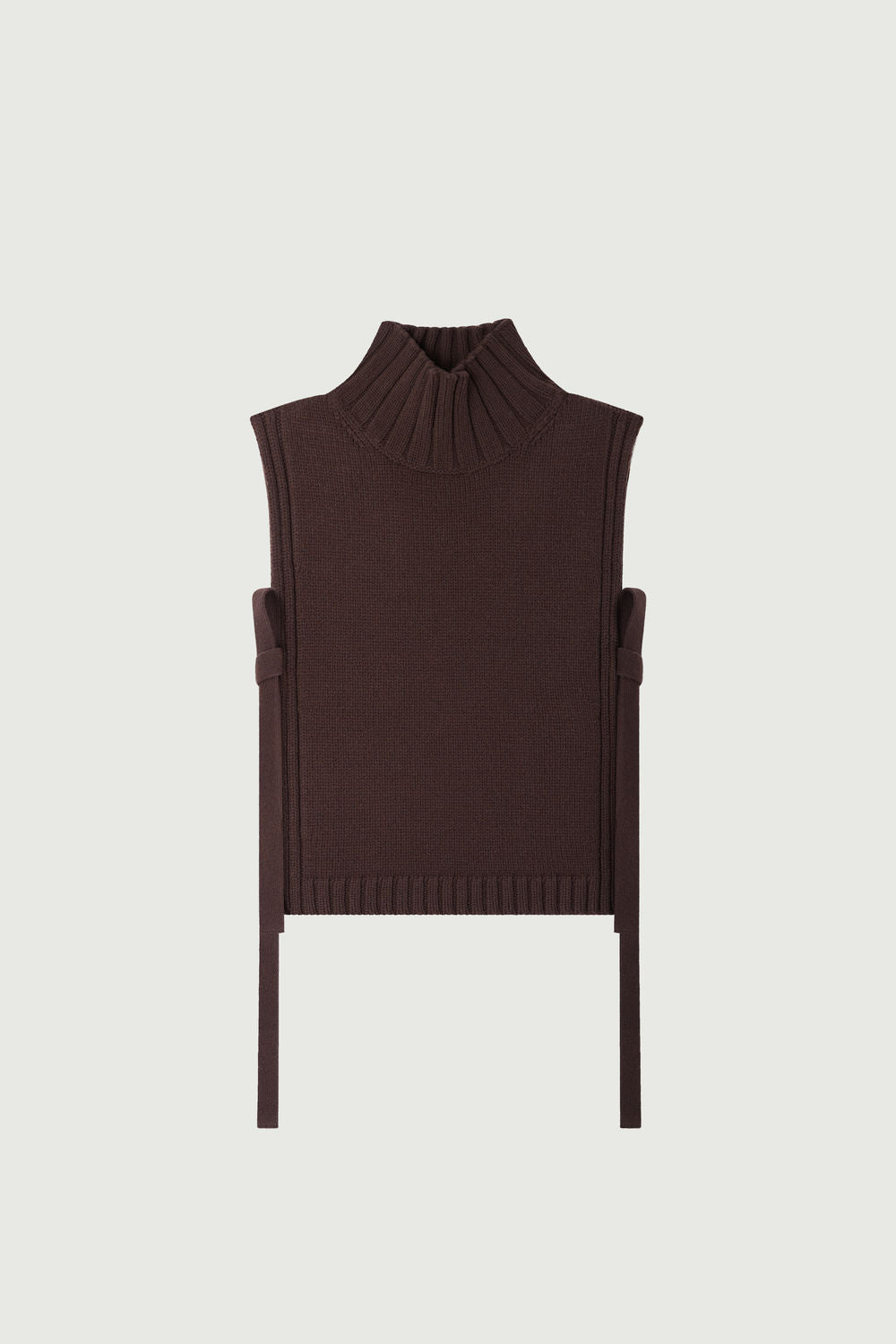 OR is a woolen bib, adjustable with two side ties to tie or leave hanging. The compact knit provides structure and a high, upright collar. It adds a stylish touch to an outfit. Conveniently, it allows freedom of arm movement when worn under a jacket or coat.